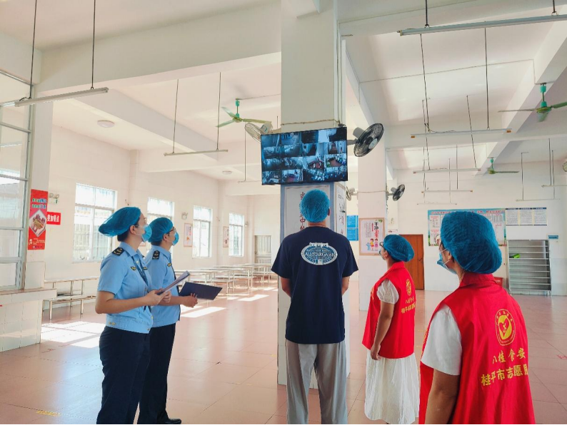 9月23日上午9时30分,正在广西壮族自治区桂平市浔州初级中学食堂操做区,清洗、切肉、调味、蒸煮等备餐工做已连续起头,各区域一片忙碌气象。取此同时,由桂平市市场监管局法律人员、家长代表、“八桂食安”意愿办事者构成的“突击”查抄组,正在校方下一同走进学校食堂内部开展“随机查餐厅”勾当,同查共检当日校园餐平安环境。